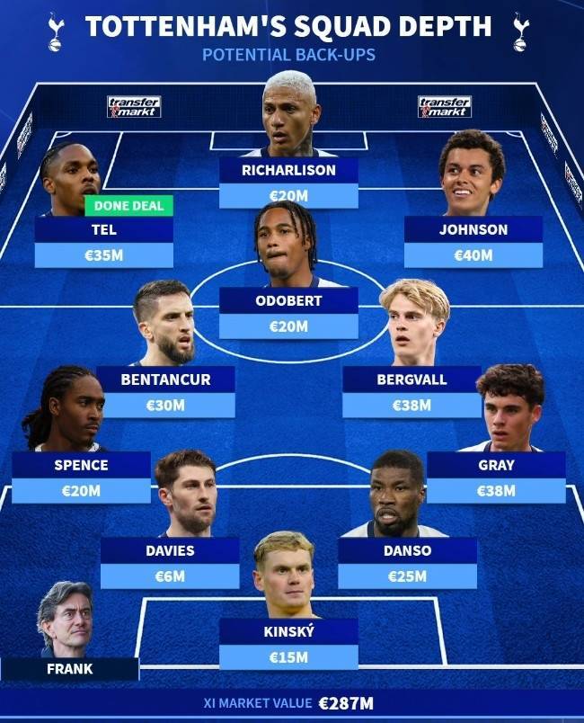 直播吧9月6日讯 《转会市场》统计了热刺新赛季的两套阵容,哈维-西蒙斯领衔5位新援在列。